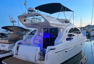 Enjoy a private luxury yacht experience aboard the Azimut 39 Fly in Marbella. Relax, sunbathe, and cruise the coast with flexible hourly rentals. Capacity for up 10 guests